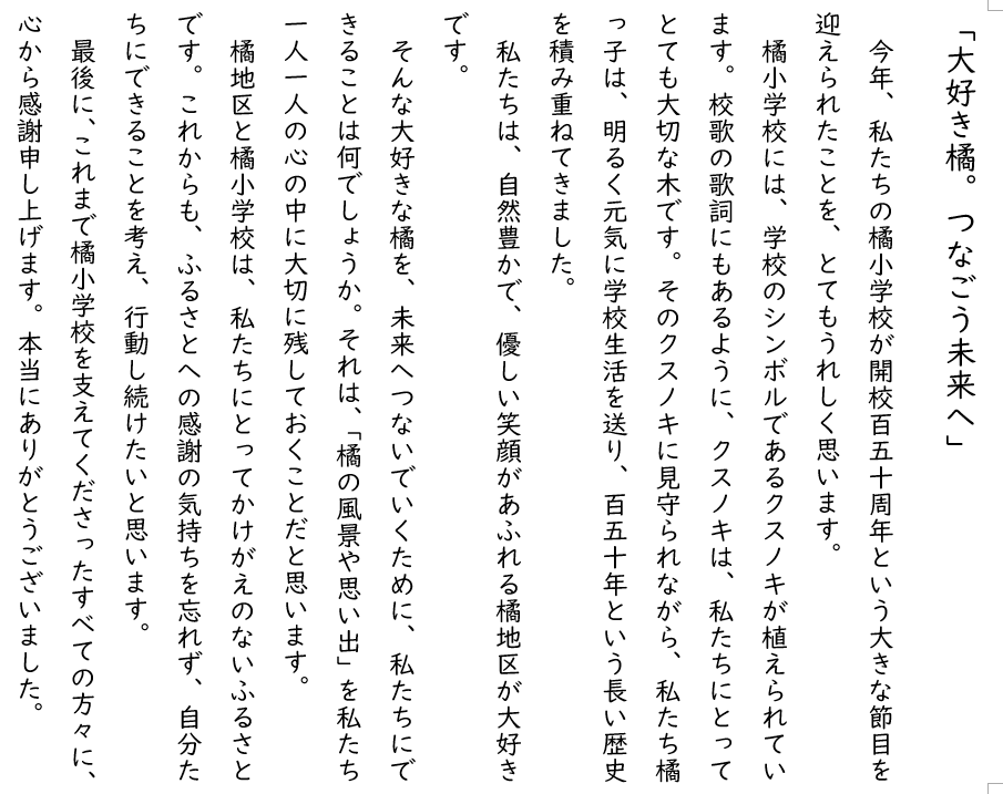 この後、会場の皆様と一緒に歌った校歌の響きに、橘小学校を大切に思う気持ちがぎゅっと込められていました。